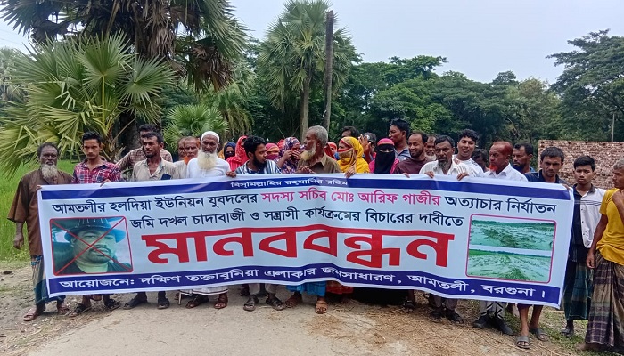 আমতলী উপজেলার হলদিয়া ইউনিয়ন যুবদল সদস্য সচিব আরিফ গাজী ও তার সহযোগী ওয়ার্ড বিএনপি সভাপতি জুয়েল মল্লিক ও জামাল গাজীর শাস্তির দাবীতে মানববন্ধন ও বিক্ষোভ মিছিল অনুষ্ঠিত হয়েছে। রবিবার দুপুরে ইউনিয়নের দক্ষিণ তক্তাবুনিয়া গ্রামে এই কর্মসূচি পালন করা হয়। এতে নারী-পুরুষসহ দুই শতাধিক মানুষ অংশ নেন।