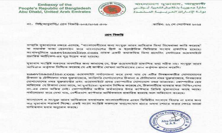 “বাংলাদেশীদের জন্য সংযুক্ত আরব আমিরাত ভিসা নিষেধাজ্ঞা জারি করেছে”—এমন শিরোনামে বাংলাদেশের কিছু প্রিন্ট ও ইলেক্ট্রনিক মিডিয়ায় সংবাদ প্রকাশিত হয়েছে। বিষয়টি বাংলাদেশ দূতাবাস, আবুধাবির নজরে এলে এ নিয়ে এক প্রেস বিজ্ঞপ্তি প্রকাশ করে দূতাবাস।