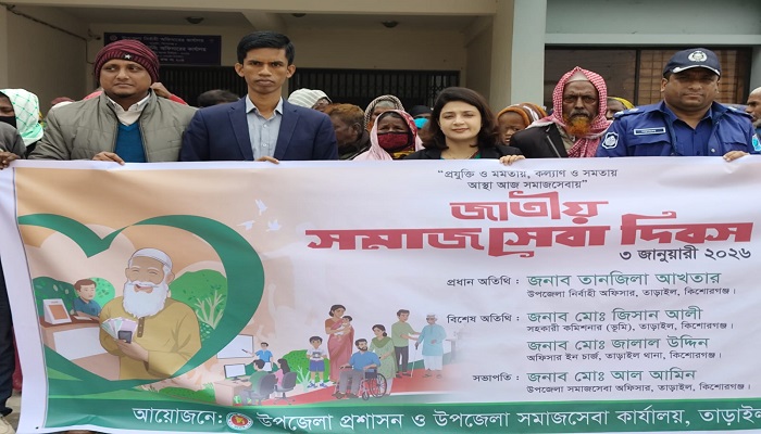 কিশোরগঞ্জের তাড়াইলে যথাযোগ্য মর্যাদায় জাতীয় সমাজসেবা দিবস পালিত হয়েছে। “প্রযুক্তি ও মমতায়, কল্যাণ ও সমতায় আস্থা আজ সমাজসেবায়” প্রতিপাদ্যকে সামনে রেখে শনিবার (৩জানুয়ারি) দিবসটি উদযাপন করা হয়।