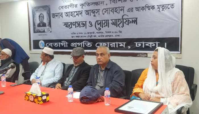 বেতাগী প্রগতি ফোরাম, ঢাকার আয়োজনে শুক্রবার (১৬ জানুয়ারি,২০২৬) জাতীয় প্রেস ক্লাবের জহুর হোসেন চৌধুরি মিলনায়তনে বিশিষ্ট লেখক, বিসিএস ৮২ ব্যাচের অবসরপ্রাপ্ত কর্মকর্তা আহমেদ আব্দুস সোবহানের আকস্মিক মৃত্যুতে এক স্মরণসভা ও দোয়া মাহফিল অনুষ্ঠিত হয়।