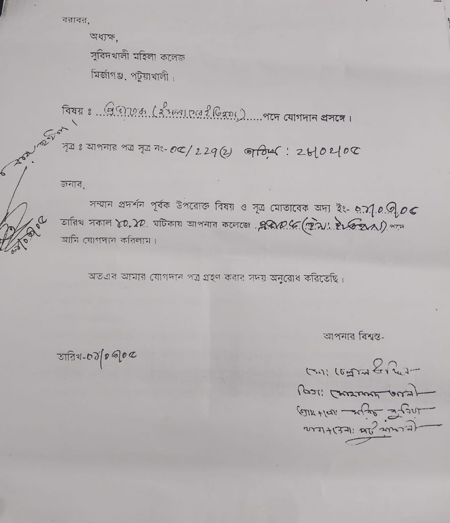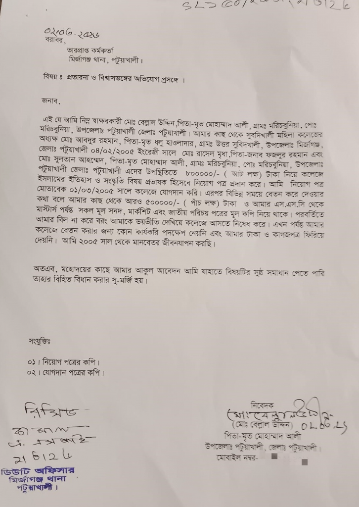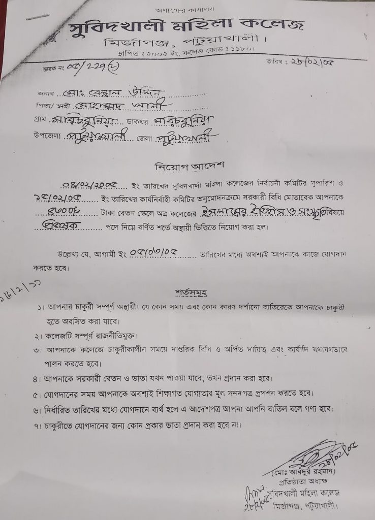 সুবিদখালী মহিলা কলেজের অধ্যক্ষ’র বিরুদ্ধে চাকরিসহ বিভিন্ন আশ্বাস ও দূর্ণীতির মাধ্যমে অর্থ আত্মসাতসহ অভিযোগের পাহাড়