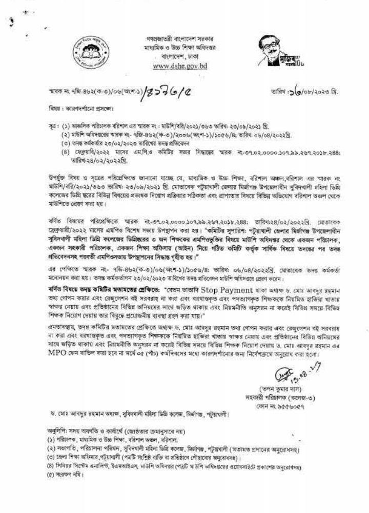 অধ্যক্ষ আব্দুর রহমানের বিরুদ্ধে ওঠা অভিযোগের প্রেক্ষিতে মাধ্যমিক ও উচ্চ শিক্ষা অধিদপ্তরও পদক্ষেপ নেয়। তথ্য গোপন, রেজুলেশন বই প্রদান না করা, বরখাস্ত ও পদত্যাগকৃত শিক্ষকদের হাজিরা খাতায় স্বাক্ষর নেওয়া এবং নিয়মবহির্ভূত নিয়োগের অভিযোগে ১৩ আগস্ট ২০২৩ তারিখে তার বেতন বন্ধ করা হয়। একই সঙ্গে তার এমপিও বাতিলের বিষয়ে কারণ দর্শানোর নোটিশ দেওয়া হয়।
