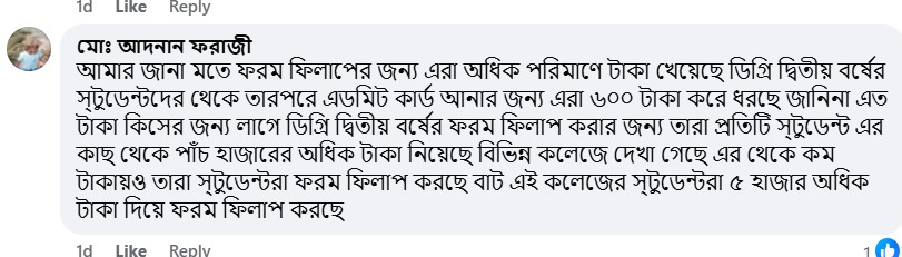 সামাজিক যোগাযোগ মাধ্যমেও অভিযোগের প্রতিফলন দেখা গেছে। মো. আদনান ফরাজী অভিযোগ করেন, কলেজে ফরম ফিলাপের নামে শিক্ষার্থীদের কাছ থেকে ৫ হাজার টাকার বেশি এবং প্রবেশপত্রের জন্য অতিরিক্ত ৬০০ টাকা নেওয়া হয়।
