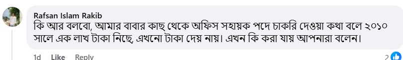 রাফসান ইসলাম রাকিব বলেন, ২০১০ সালে আমার বাবার কাছ থেকে অফিস সহায়ক পদে চাকরি দেওয়ার কথা বলে ১ লাখ টাকা নেওয়া হয়েছিল। আজ পর্যন্ত টাকা ফেরত পাওয়া যায়নি।