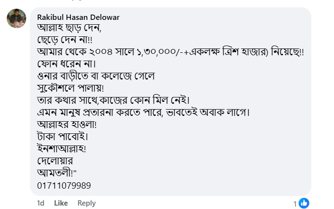 রকিবুল হাসান দেলোয়ার বলেন, একটি একাডেমিক ভবনের অনুমোদন এনে দেওয়ার কথা বলে আমার কাছ থেকে ১ লাখ ৩০ হাজার টাকা নেওয়া হয়। কিন্তু কোনো কাজ করেননি। এখন ফোন দিলেও ধরেন না। বহুবার কলেজ ও বাড়িতে গিয়েছি, কিন্তু এড়িয়ে গেছেন।